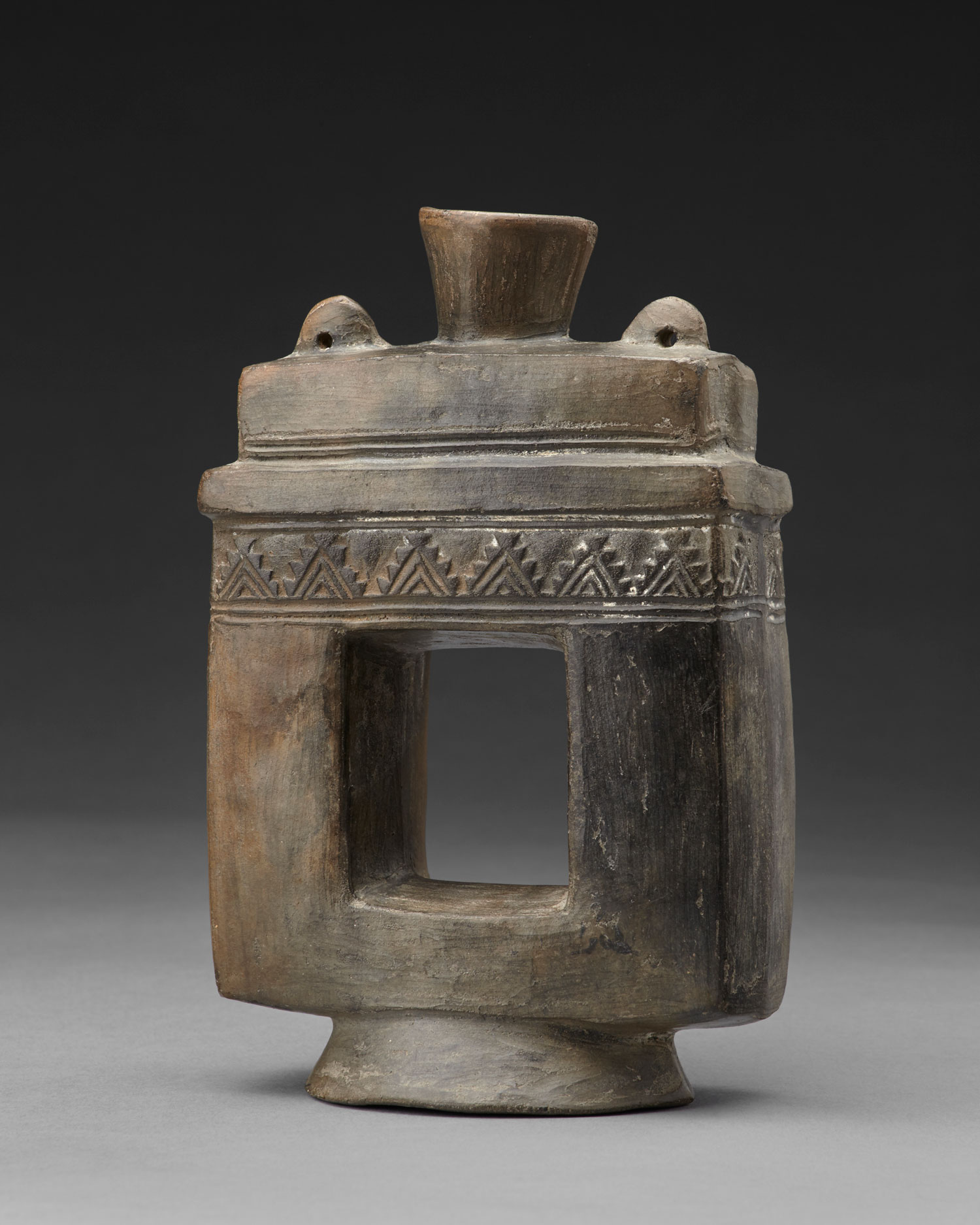 Gracias a las representaciones arquitectónicas en cerámica nos podemos dar una idea de cómo eran las edificaciones de distintas sociedades del antiguo Perú. Así, este ceramio nos indica que ciertas edificaciones de la cultura Lambayeque poseían ventanas circulares por donde ingresaba el aire y la luz, así como motivos escalonados, utilizados también en otros soportes, que conformaban la decoración de la fachada del recinto. Por los vigilantes que se hallan en la entrada del edificio representado y por la decoración especial de los muros, es posible que esta pieza de cerámica sea la representación de un recinto importante.