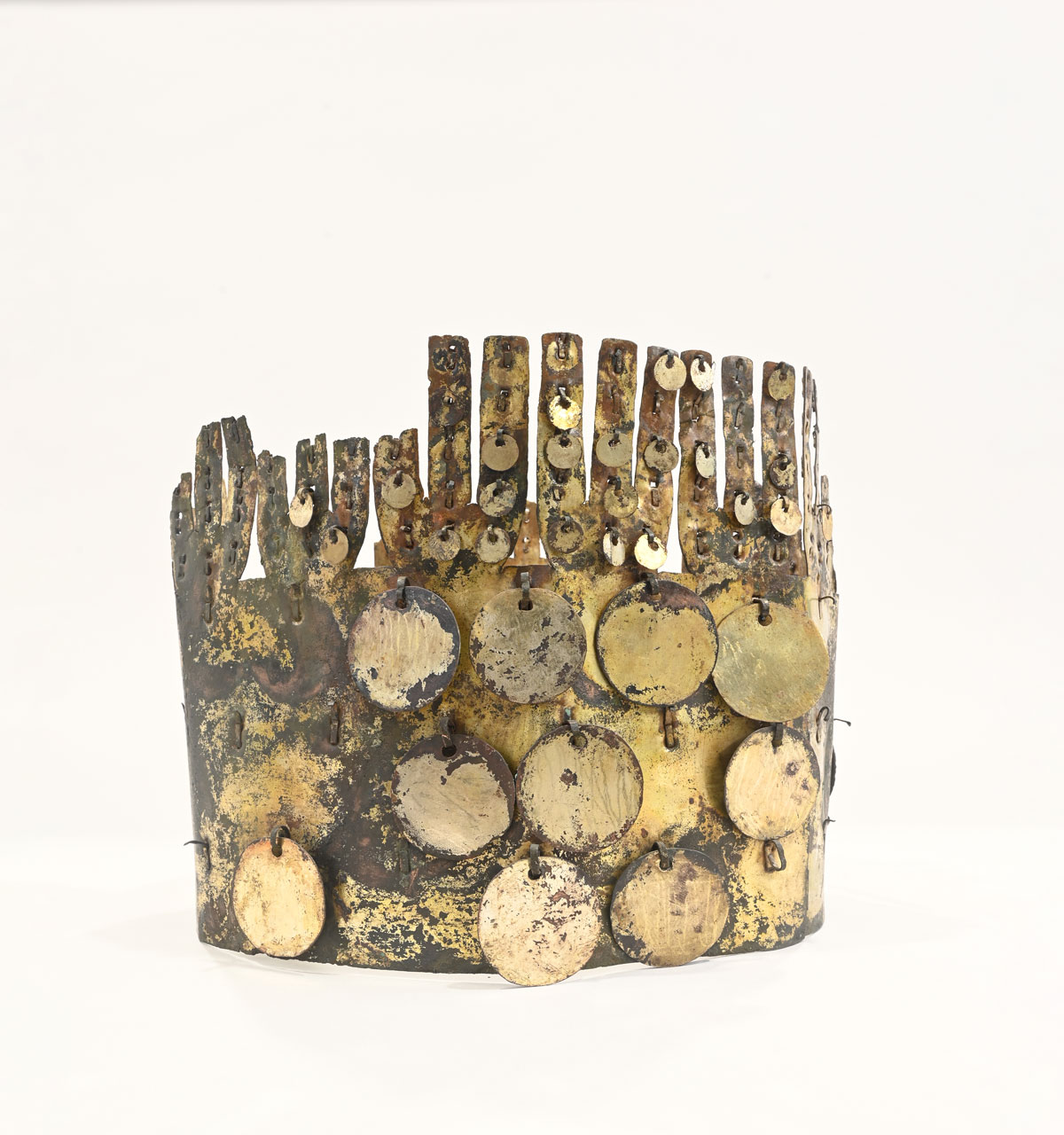 Coronas como esta, utilizadas en ocasiones especiales como en fiestas y rituales, eran una de las piezas más distintivas, ya que sus pequeños discos movibles producían brillo y sonido con cada paso de su portador, lo cual podía infundir cierto temor y respeto en quienes lo contemplaban.